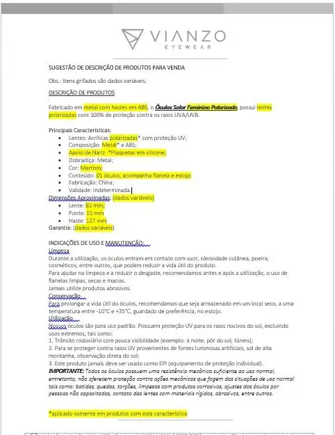 IMPORTANTE: Todos os óculos possuem uma resistência mecânica suficiente ao uso normal, entretanto, não oferecem proteção contra ações mecânicas que fogem das situações de uso normal tais como: batidas, quedas, torções, limpezas com produtos corrosivos, ajustes dos óculos por pessoas não capacitadas, contato das lentes com materiais rígidos, abrasivos, entre outros.